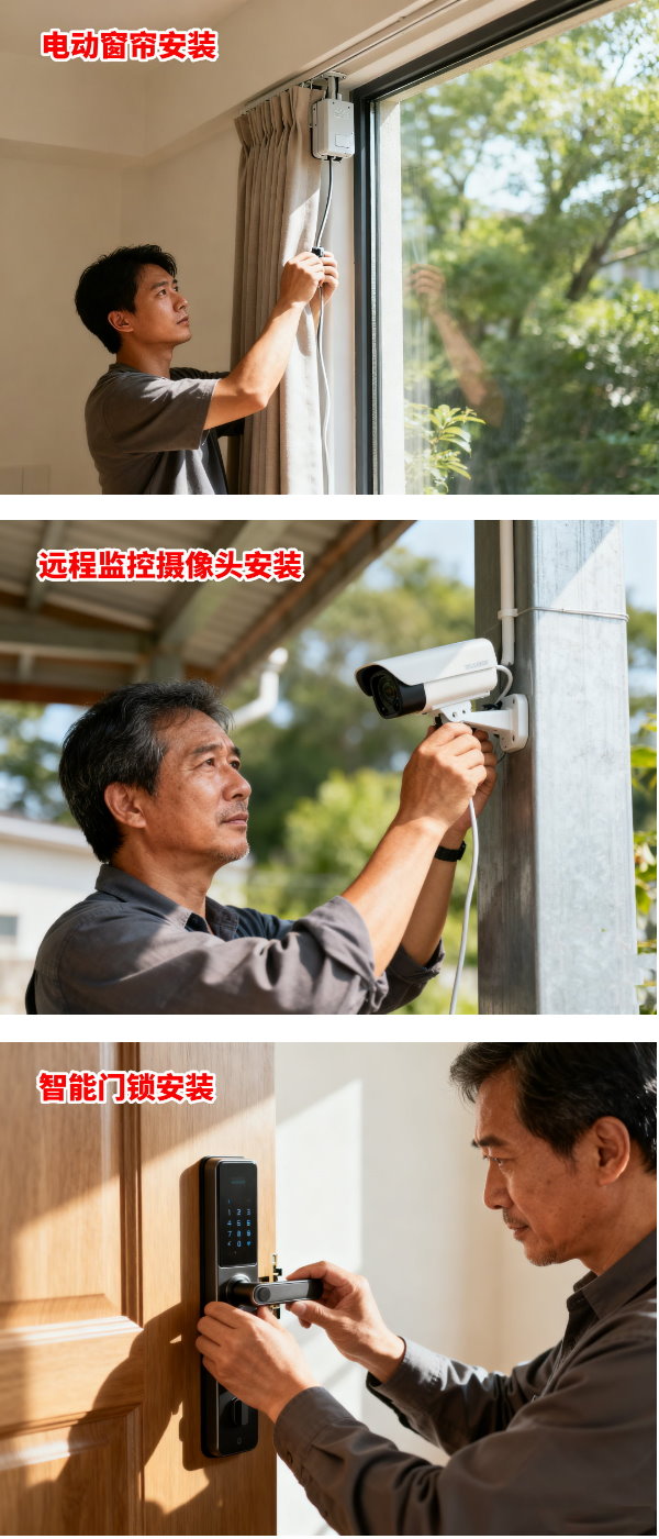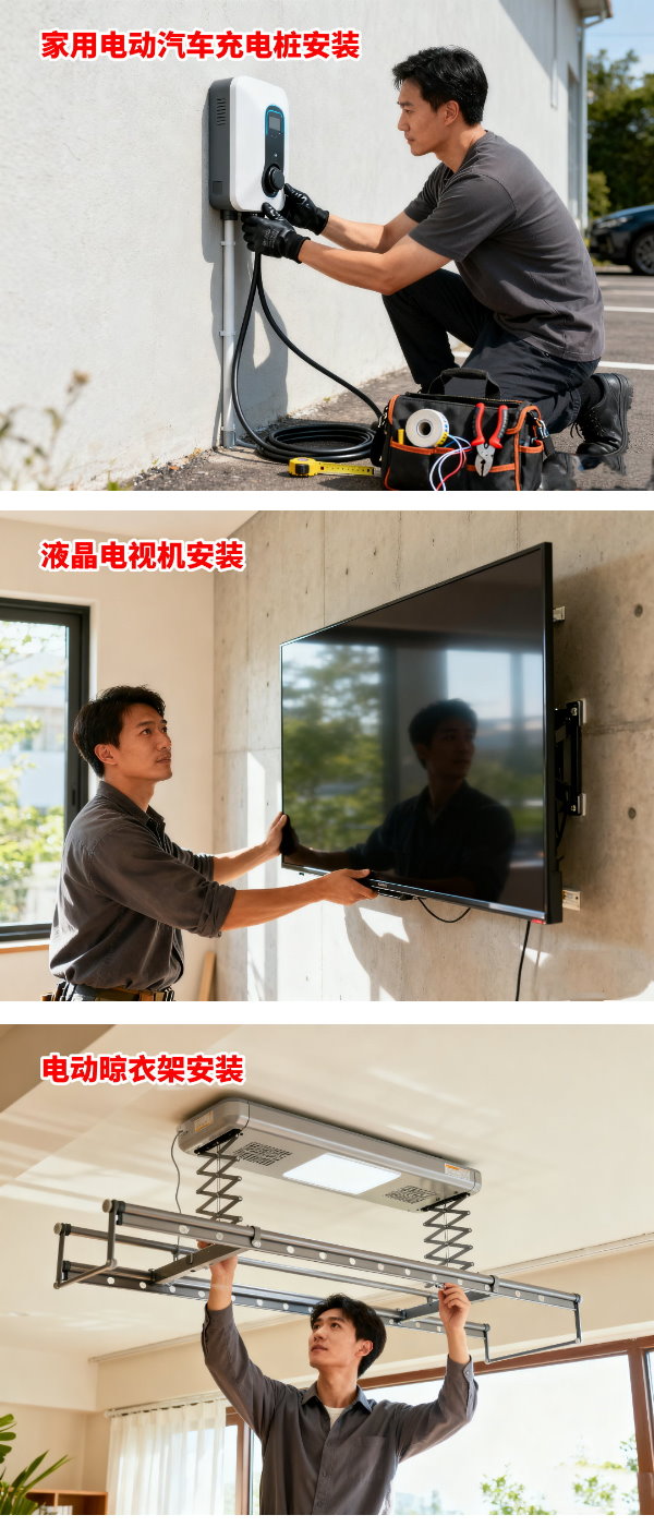 ③ 智能与新兴设备模块:**含智能门锁安装、远程监控摄像头安装、电动窗帘 / 电动晾衣架安装、家用汽车充电桩安装、投影仪吊装;