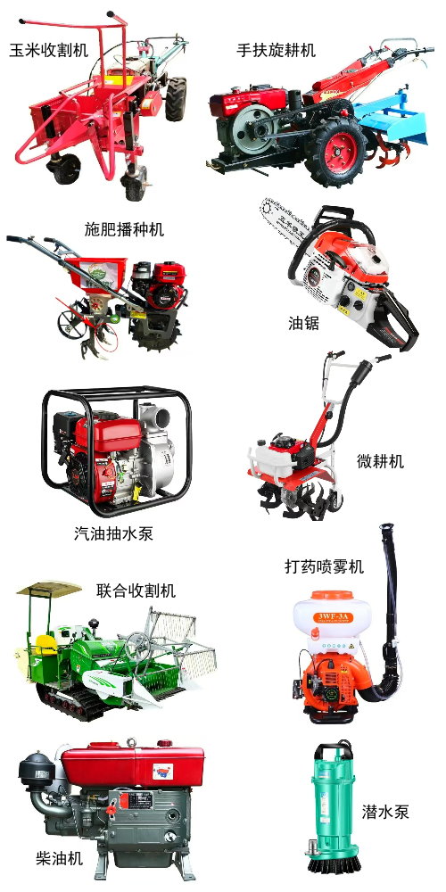 3,微耕机、拖拉机、手扶旋耕机、播种机、小型联合收割机、玉米收获机、油锯、喷雾机、柴油机、汽油发电机、汽油机水泵、潜水泵。